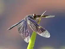 Rhyothemis princeps is found in Australia and New Guinea only. It is a medium-sized dragonfly (wingspan 70mm, length 40mm) that inhabits a variety of freshwater lakes, ponds, and swamps. It has a dark blue to black abdomen, and its wings are dark, with two or three pale patches on the outer section. Males have dark patches extending to their wingtips, whereas females have clear wingtips. In sunlight the dark colours can reflect a metallic purplish tinge. In Australia its range is limited to north-eastern Queensland from Cape York Peninsula to around Rockhampton.[3]