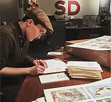 The Kingdom Animalia Project is a series of artwork made by artist Ria Brodell from December 15, 2015 through March 1, 2017.[28] By drawing a different animal every day, Brodell was able to gain insight into "the magnitude of animal species around the world."[28] In a 2016 interview with Jess Dugan, Brodell explained that this project stemmed from their "strong interest in animal rights and conservation" and by July 2016, the series contained over 200 pieces.[29] Brodell also mentioned that this project allowed them to continually practice drawing and to focus mentally.[29] Some of the many species that Brodell drew include a variety of different insects, reptiles, birds, sea creatures, and mammals.[28] The works in this project are completed on small pieces of paper using colored pencils or gouache for the main subject and watercolor to create vibrant colored backgrounds.[28] In a 2018 interview with Ellen Caldwell, Brodell was asked if there were any connections between Kingdom Animalia and other works such as Butch Heroes or The Distant Lands, considering that Kingdom Animalia was significantly different both artistically and stylistically.[30] Brodell mentioned that despite the differences the overarching connection between those works was their "desire to make work that addresses subjects that [they] feel strongly about."[30]
