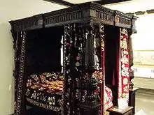 Bed, thought to belong to Richard Corbet. Textiles are modern replicas. Shrewsbury Museum and Art Gallery.