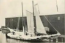 On January 25, 1879, the pilot-boat Lillie was caught out in Boston Bay by a 68-miles per-hour wind and stormy sea. Captain Lawler had to light a woolen cloth in kerosene to thaw the frozen ropes and sails. The Lillie survived the storm and was towed to the Gallops Island Wharf and then to her home in Boston. She was later sold c. 1884 to the New York pilots and renamed the Richard K. Fox.[5][6]