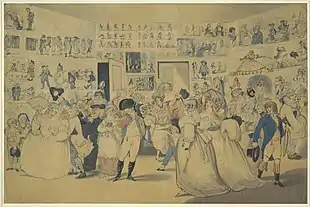 Born in London, Newton published his first caricature at thirteen. His work included caricatures expressing the English prejudice of the Scots as lean and hungry opportunists. He worked for radical publisher William Holland, producing anti-slavery works among his output, as well as "rude assaults" against Napoleon and the Royal Family.[1] Newton minded Holland's shop when Holland was imprisoned for sedition during 1793–94. His watercolour (now in the British Museum) of fashionably dressed Londoners looking at prints in Holland's shop in Oxford Street, London, gives a depiction of an 18th-century print shop, and images of many of Holland's actual prints can be recognized on the walls.[2] In 1794, Holland published an edition of Laurence Sterne's A Sentimental Journey Through France and Italy with twelve plates by Newton.[3]
