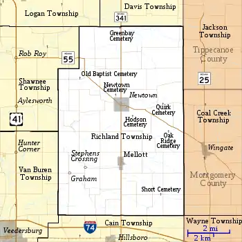 According to the 2010 census, the township has a total area of 51.94 square miles (134.5 km2), all land.[1] It contains two incorporated towns: Newtown, with a population of about 250, lies near the center of the township; Mellott, with about 200 people, is about 2 miles (3.2 km) south. Indiana State Road 341 passes through both towns;[2] Indiana State Road 55 intersects State Road 341 in Newtown.[3] The two unincorporated communities of Graham and Stephens Crossing both lie to the southwest of Newtown along the route of a former railroad which came out of Veedersburg and also passed through Mellott and continued east.