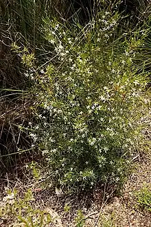 Ricinocarpos glaucus is an erect, monoecious or diocious shrub that typically grows to height of up to 2 m (6 ft 7 in) with hairy young branchlets. The leaves are linear to narrowly oblong, 10–40 mm (0.39–1.57 in) long and 0.8–2 mm (0.031–0.079 in) wide on a densely hairy petiole 1–2 mm (0.039–0.079 in) long. The upper surface of the leaves is glabrous and the lower surface is covered with soft, white, woolly hairs. The flowers are arranged singly, or with two to four male flowers, or one female surrounded by up to three male flowers. Male flowers are on a slender, more or less glabrous pedicel 7–25 mm (0.28–0.98 in) long, the sepals covered with woolly, white, star-shaped hairs on the inside surface. The sepal lobes of male flowers are usually triangular, 1.5–3 mm (0.059–0.118 in) long and the petals narrowly oblong, white and 5–12 mm (0.20–0.47 in) long and 1.5–2.7 mm (0.059–0.106 in) wide. Female flowers are on a stout pedicel 7–20 mm (0.28–0.79 in) long, the sepals densely hairy on the inside surface, the petals white, 7–10 mm (0.28–0.39 in) long and 1.6–2 mm (0.063–0.079 in) wide. Flowering occurs from June to September, and the fruit is a glabrous, oblong capsule 6.5–8 mm (0.26–0.31 in) long and has three lobes.[2][3]