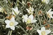 Ricinocarpos gloria-medii is a spreading monoecious or diocious shrub that typically grows to height of up to 2 m (6 ft 7 in) with rusty-hairy young branchlets. The leaves are linear, 25–60 mm (0.98–2.36 in) long and 1.3–3.5 mm (0.051–0.138 in) wide on a densely hairy petiole 2–3 mm (0.079–0.118 in) long. The upper surface of the leaves is more or less glabrous and the lower surface is covered with soft, white, woolly hairs. The flowers are arranged singly, or with two to four male flowers, or one female surrounded by up to four male flowers. Male flowers are on a slender, densely hairy pedicel 7–17 mm (0.28–0.67 in) long, the sepals covered with woolly, white, star-shaped hairs on the inside surface. The sepal lobes of male flowers are egg-shaped, 4.5–7 mm (0.18–0.28 in) long and the petals egg-shaped, white or cream-coloured, 7–11 mm (0.28–0.43 in) long and 3–5 mm (0.12–0.20 in) wide. Female flowers are on a stout pedicel 10–15 mm (0.39–0.59 in) long, the sepals densely hairy on the inside surface, the petals white or cream-coloured, 6.5–8 mm (0.26–0.31 in) long and 3–4 mm (0.12–0.16 in) wide. Flowering has been observed in June and July, and the fruit is a more or less spherical capsule 10–11 mm (0.39–0.43 in) long and wide.[2][3]