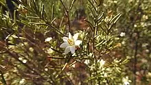 Ricinocarpos trachyphyllus is a species of flowering plant in the family Euphorbiaceae and is endemic to eastern Australia. It is an monoecious or dioecious shrub with linear leaves and white flowers, arranged either singly, or with 3 male flowers, or one female flower surrounded by three male flowers.