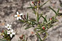 Ricinocarpos undulatus, commonly known as wedding bush,[2] is a species of flowering plant in the family Euphorbiaceae and is endemic to the south-west of Western Australia. It is an erect, monoecious or dioecious shrub with linear leaves, and white flowers in a umbel with either a single male or female flower, 2 to 5 male flowers, or a single female flower surrounded by up to 3 male flowers.