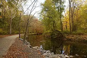 The location of Ridley Creek State Park, just 16 miles (26 km) from downtown Philadelphia, has led to its popularity. Ridley Creek is very popular with fishermen. It is stocked with trout by the Pennsylvania Fish and Boat Commission. A portion of the creek is a designated catch and release area for fly fishing only. There is a wheelchair accessible fishing platform on a multi-use trail. The 12 miles (19 km) of hiking trails at Ridley Creek State Park are popular with dog owners.[10] These trails pass through a variety of habitats. A 5-mile (8 km) multi use trail is open to jogging, bicycling and walking. The park also features a 4.7-mile (7.6 km) equestrian trail.[1][11]