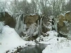 Rifle Falls State Park is a Colorado State Park located in Garfield County northeast of Rifle, Colorado. The central feature of the 48-acre (0.19 km2) park is a triple 70-foot (21 m) waterfall flowing over a travertine dam on East Rifle Creek. Commonly seen wildlife includes mule deer, elk, coyote, and golden-mantled ground squirrel. Rainbow and brown trout can be caught in the creek. Limestone cliffs near the falls have a few small caves and three species of bats. Visitor facilities include campsites, picnic sites and 2.0 miles (3.2 km) of hiking trails.