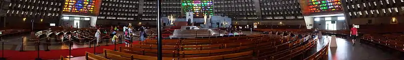 The New Cathedral, as it is sometimes called, is located in the center of the city. Conical in form and with a 96 metres (315 ft) internal diameter — 106 metres of external diameter — and an overall height of 75 metres (246 ft). Inside, the area measures 8,000 square meters and sufficient 5,000 seats(; it has a standing-room capacity of 20,000 people).