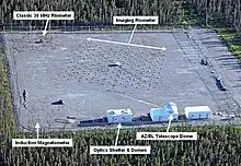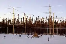 A riometer (commonly relative ionospheric opacity meter, although originally: Relative Ionospheric Opacity Meter for Extra-Terrestrial Emissions of Radio noise[1]) is an instrument used to quantify the amount of electromagnetic-wave ionospheric absorption in the atmosphere.[2] As the name implies, a riometer measures the "opacity" of the ionosphere to radio noise emanating from cosmic origin. In the absence of any ionospheric absorption, this radio noise, averaged over a sufficiently long period of time, forms a quiet-day curve. Increased ionization in the ionosphere will cause absorption of radio signals (both terrestrial and extraterrestrial), and a departure from the quiet-day curve. The difference between the quiet-day curve and the riometer signal is an indicator of the amount of absorption, and is measured in decibels. Riometers are generally passive radio antenna operating in the VHF radio frequency range (~30-40 MHz). Electromagnetic radiation of that frequency is typically Galactic synchrotron radiation and is absorbed in the Earth's D region of the ionosphere.