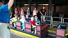 | Trains | 5 cars. Riders are arranged 2 across in 3 rows for a total of 30 riders per train. |
