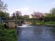 Just before Stamford, the Great North Road, now labelled the A1, crosses the river, and a pumping station on the north bank at Stamford Meadows has pumped large quantities of water to the Rutland Water reservoir since its construction in 1975.[23] Stamford was the lowest point at which the river could be forded so the Roman Ermine Street crossed the Welland there. The A16 road crosses the river by a three-arched stone bridge designed by Edward Browning in 1845.[24] Below it, Albert Bridge is made of iron with stone piers, and was erected by Stamford Town Council in July 1881, to replace an earlier bridge which was washed away in a flood.[25] Beyond Stamford, the river passes the site and ruins of the Benedictine St Leonard's Priory.[26] Hudd's Mill marks the point at which the Stamford Canal left the river. The present mill building dates from 1751 and 1771.[27] The River Gwash, which the canal crossed on the level, joins from the north, and the remains of the canal follow the river on its north bank. Below Uffington, the county border follows the old course of the river, first to the south to Tallington and then to the north, while the main course now flows along the Maxey Cut to Peakirk. The old course consists of two streams, fed by sluices from the Maxey Cut, which meander to The Deepings. The eastern stream supplied power to Lolham and Maxey mills, while the western stream did the same for Tallington Mill, which dates from around 1700,[28] West Deeping mill, and Molecey's mill, which still retains its seventeenth-century undershot waterwheel, modified in the 19th century to Poncelet's improved design, and the only surviving waterwheel of its type in Lincolnshire.[29] At the western edge of Market Deeping the two streams join, and they are also joined by the Greatford Cut, which has carried the diverted waters of the West Glen river since the early 1950s.[9]