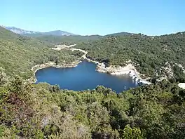 The reservoir holds 1,000,000 cubic metres (35,000,000 cu ft) of water.[2] It feeds a power plant 7 kilometres (4.3 mi) downstream.[5] A tunnel carries water from the dam to the hydroelectric power station at Sainte Lucie de Tallano in the Levo plain.[3] The power is delivered during daily peak periods of electricity consumption. With installed capacity of 55 MW the power plant delivers almost 40% of the island's hydroelectricity. Annual output is estimated at 80GWh.[3]