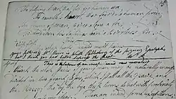The poet died on 21 July 1796 and the manuscript was at that time at Ellisland Farm. In January 1797 both Commonplace books were sent to Dr James Currie in Liverpool who used some of this material in his The Complete Poetical Works of Robert Burns: With Explanatory and Glossarial Notes; And a Life of the Author which was he published in four volumes in 1800. Both of the Commonplace books remained with Dr Currie as did the other material, such as the Glenriddell Manuscripts.[17] Shortly before his death in 1805 it narrowly escaped being burnt.[17] William Wallace Currie, James's son, inherited the book and when he died in 1840 it again narrowly escaped destruction as his will instructed his wife to destroy or keep the manuscripts that were in his possession.[17] They passed to Sarah France Currie, James's daughter-in-law. Messrs. Puttick and Simpson of London on 2 May 1861 offered the book for auction as lot no. 203, but the catalogue did not indicate ownership, although the evidence suggests that the Currie Estate had instructed the sale.[17]