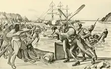 Once April came, Gray and Columbia Rediviva sailed south while Adventure sailed north. After wintering on Vancouver Island, Gray set sail again on April 2, 1792, when he left the trading post of Clayoquot.[19] As he departed, Gray ordered the destruction of the Nuu-chah-nulth (Nootka) village of Opitsitah (Opitsaht).[20] The attack was a retaliation for insults he thought he had endured and in response to rumors of a plot against his men conceived by some local natives and a Sandwich Islander of his own crew. The plot may have been real, but might have been a misunderstanding.[21] The village of Opitsaht, which consisted of about 200 houses with much carved work—a "fine village, the Work of Ages", according to Gray's officer John Boit, which was "in a short time totally destroy'd".[22] Fortunately, it was deserted at the time.[21] John Boit, the keeper of his own ship's log, wrote that Gray had let his passions go too far.[23][24] In 2005, descendants of Gray formally apologized for the destruction of Opitsaht.[25] Gray ordered several other attacks during the 1792 voyage. In May 1792, Gray ordered an attack on a Chicklisaht Nuu-chah-nulth village in Esperanza Inlet or Nasparti Inlet north of Nootka Sound, killing seven and seizing the natives' sea otter furs. The Chicklisaht took their wounded to the Spanish post at Nootka Sound and asked the commandant, Bodega y Quadra, to punish Gray.[26] This attack came after a breakdown in trading negotiations. The price of sea otter furs had increased dramatically since the late 1780s. Gray was one of a number of captains who decided to use force to acquire furs.[22] Later in 1792, in Grays Harbor, Captain Gray fired on a group of Chinooks, killing 20. Still later, in Clayoquot Sound again, Gray killed or wounded at least 25 natives who were approaching his ship in a war canoe during the night. He battled a group of Kwakiutls in late 1792.[22]