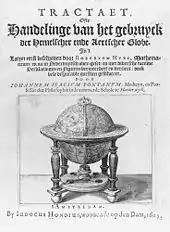 - Hues, Robert (1623), Tractaet ofte Handelinge van het gebruyck der Hemelscher ende Aertscher Globe: In't Latyn eerst beschreven door Robertvm Hves, Mathematicum / en nu in Nederduytsch over-geset en met diversche nieuwe Verklaringen en Figuren vermeerdert en verciert / oock vele disputable questien gesolveert, door Iohannem Isacivm Pontanvm, Medicyn, en Professor der Philosophie inde vermaerde Schole te Harderwyck [Treatise or Essays on the Use of the Heavenly and Earthly Globe: First Described in Latin by Robert Hues, Mathematician / and now Translated into Dutch, and Expanded and Decorated with New Clarifications and Figures / also many Disputable Questions Solved, by John Isaac Pontanus, Physician and Professor of Philosophy of the renowned School in Harderwijk], Amsterdam: Iudocus Hondius, woonende op den Dam [living on the Dam ], OCLC 51084257.[43]