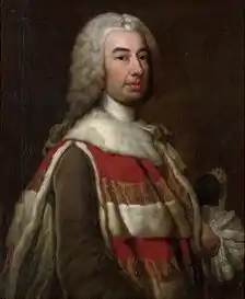 Robert Knight, Baron Luxborough, by George Knapton, 1748/9. He wears the robes of an Irish peer and holds a tricorn hat under his left arm