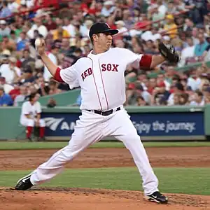 Manuel pitching for the Boston Red Sox in 2010