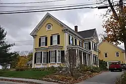 The Robert P. Carr House stands on the north side of Main Street (Maine State Route 125), a short way east of its junction with Center Street and Back Hill Road. It is an L-shaped 2+1⁄2-story wood-frame structure, with a cross-gable roof, clapboard siding, and granite foundation. Its street-facing front facade is two bays wide, with polygonal bays on the first floor topped by bracketed hip roofs. The building corners have paneled pilasters, rising to an eave studded with paired brackets. The front gable has a deep eave, also with paired brackets and modillions. A round window is at the center of the gable, sheltered by a bracketed hood. The main entrance is on the right side, near the crook of the L, sheltered by a porch. The interior of the house features high quality period woodwork.[2]