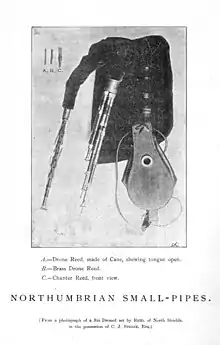A photograph of a six-drone set of Northumbrian Smallpipes, made by James Reid of North Shields, used as the frontispiece of Fenwick's tutor for the instrument, published 1896.