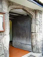 The Robin Hood Inn building has late medieval origins.[1] It is constructed in stone, with a wide, four-centre doorway dating to the fifteenth century, and is a rare medieval survival in Monmouth.[2] After the Reformation, the town was a centre for Catholicism[3] and the landlord in the 1770s, Michael Watkins, allowed Mass to be celebrated in an upper room of the pub. The Penal Laws against Catholics were in force until the Papists Act of 1778, and Watkins was amongst those who successfully petitioned Monmouth magistrates to allow a building that would become St Mary's Roman Catholic Church. This public house and the church that Michael Watkins lobbied for are two of the 24 buildings in the Monmouth Heritage Trail.[4] A blue plaque was added to the exterior of the building in 2009, which celebrated the religious history of the building.[5]