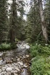 Cow Creek Trail follows Cow Creek, with its many beaver ponds, extending past the Bridal Falls turnoff as the Dark Mountain trail, then joining the Black Canyon trail to intersect the Lawn Lake trail shortly below the lake.[43] North Boundary Trail connects to the Lost Lake trail system. North Fork Trail begins outside of the park in the Comanche Peak Wilderness before reaching the park boundary and ending at Lost Lake. Stormy Peaks Trail connects Colorado State University's Pingree Park campus in the Comanche Peak Wilderness and the North Fork Trail inside the park.[43]