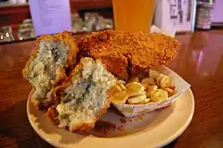 Rolled oyster is a baseball-sized seafood dish that is found only in and around Louisville, Kentucky. It consists of three raw oysters dipped in an egg-milk cornmeal batter called pastinga, rolled in cracker crumbs (hence the name), and deep fried. They were first served by Italian immigrant Phillip Mazzoni and his brothers in the late 19th century as a free giveaway to their saloon patrons with a purchased beer or whiskey. It is unknown if rolled oysters were actually invented by the Mazzonis, or if the recipe was brought over from Italy with them. During prohibition, Mazzoni's remained open by selling these oysters in their new restaurant and it became a popular food item all over town. Today, most seafood restaurants and fish fries in the Louisville area will have their own version of these on their menus.[1] Home Run Burgers and Fries had a version that was very popular as well.
