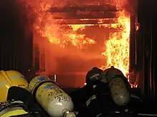 Rollover (also known as flameover) is a stage of a structure fire when fire gases in a room or other enclosed area ignite.[1] Since heated fire gases, the product of pyrolysis, rise to the ceiling, this is where a rollover phenomenon is most often witnessed. Visually, this may be seen as flames "rolling" across the ceiling, radiating outward from the seat of the fire to the extent of gas spread.