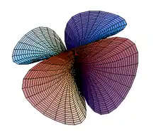 A pair of lobes can be seen in the West and East directions of Figure 3. Another pair of lobes are hidden underneath the third (z = xy) paraboloid and lie in the North and South directions.