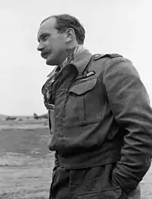 In the 1965 New Year Honours he was appointed Commander of the Order of the British Empire (CBE).[14] At the end of January, he was part of the RAF cortège at the funeral procession for former prime minister Winston Churchill. Later in the year he returned to a command posting, of the RAF station at Lindholme.[1][6] Promoted to air commodore at the start of 1966,[15] his final years of military service was spent in charge of operations at the Board of Trade.[1]