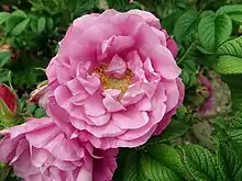 'Charles Albanel' is a medium-sized, very bushy Hybrid Rugosa variety, 2 to 4 ft (0.61–1.22 m) in height, with a 3 to 4 ft (0.91–1.22 m) spread.[2] It has semi-double (15–20 petals), medium-sized 3.1 in (79 mm) flowers and a cluster-flowered bloom form. Blooms are reddish-purple with shades of mauve, and have yellow stamens. Flowers are carried in clusters of 3–7 and have a strong, fruity fragrance. The plant has healthy pale green foliage and many prickles. 'Charles Albanel' grows more horizontally than vertically and is often grown as a low shrub. It flowers early and profusely and will repeat somewhat sporadically for the rest of the season.[1]