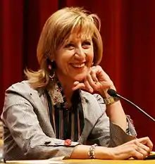 She positioned herself on the centre-left unequivocally throughout her time as a socialist activist.[16] Nevertheless, Rosa Díez has located herself on the centre-left and cross-sectionalism simultaneously since she left the PSOE,[17] defending what she deems progressive from anywhere on the left–right political spectrum vehemently and asseverating that the political centre, which can only be understood, to her mind, as moderation and equidistant space between left and right, is nothingness.[18][19] Furthermore, she defines herself as a "radical democrat who strives for democracy's regeneration by playing according to the rules";[20] expressed differently, as a "pro-institutional leader whose radical politics, moderate in the process and revolutionary in essence, bothers the establishment", for she wants to "transform politics by bringing off substantial, in-depth changes from within institutions".[21] Hence, owing to her self-proclaimed cross-sectionalism and radicalism, Rosa Díez has been linked to radical centrism.[22][23][24]