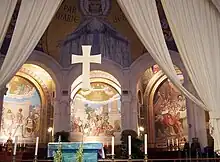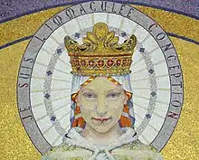 In the upper wall of the sanctuary is a mosaic depicting Mary with outstretched arms and the caption Par Marie à Jésus ("Through Mary to Jesus").[2] This depiction, of a very young woman facing directly forwards, is much more in keeping with Bernadette's descriptions of the apparition than the iconic statue in the niche in the Grotto.