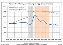 Development of population since 1875 within the current Boundaries (Blue Line: Population; Dotted Line: Comparison to Population development in Brandenburg state; Grey Background: Time of Nazi Germany; Red Background: Time of communist East Germany)