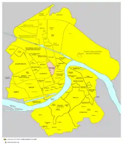 Map of the urban area of Novi Sad with city quarters, showing the location of Rotkvarija