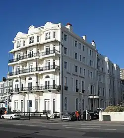 Standing slightly forward of Royal Crescent immediately to the east, the building now known as Royal Crescent Mansions was originally built as a two-storey house in the early 19th century.[26] Former Foreign Secretary and Prime Minister George Canning once lived there;[12] this is commemorated by a heritage plaque designed by Eric Gill in the 1920s.[27] Extension to five storeys and conversion into a hotel began in 1848,[26] and it opened in its new form in 1857.[18] Some remodelling took place later in the 19th century.[26] The sea-facing façade has a three-window range: from left to right, canted, bowed and canted. Iron balconies span the second, third and fourth floors.[18] The building has nine windows on each floor on its west façade, next to Royal Crescent, and eleven to the east (facing Burlington Street).[26] After many years as a hotel, it was converted to flats.[27]