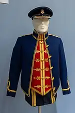 The Royal Wessex Yeomanry Tactical Recognition Flash (TRF) is taken from the 74th (Yeomanry) Division, whose insignia was a broken spur in a black diamond during the First World War. It is used to signify that its units were once mounted but now served as infantry. The TRF took its colour scheme from the facings of the collars and cuffs of the Royal Gloucestershire Hussars (buff), Royal Wiltshire Yeomanry, Dorset Yeomanry and the Royal Devon Yeomanry (all scarlet).[10] In 2016 the colour scheme of the TRF was changed, replacing the scarlet with blue, and the 'broken spur' replaced by a complete spur.[11]