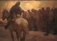 ![]() Nach dem Vorstoß, Russische Kriegsgefangene, 1917, oil on canvas, c. 100 × 140 cm, Heeresgeschichtliches Museum | |