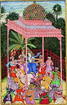 Rukmi (Sanskrit: रुक्मी) is the ruler of Vidarbha according to the epic Mahabharata. He was the son of King Bhishmaka and the elder brother of Rukmini.[1] The Harivamsa mentions that Rukmi was trained in the arts of warfare by the ruler of Kimpurushas, Druma. He also obtained weapons from Parashurama. Krishna married Rukmini by eloping with her from Vidarbha, even though Rukmi wanted to give her as a bride to the Chedi king Shishupala. He fought with Krishna, but was defeated. When Krishna was about to kill him, Rukmini begged that he spare her brother's life. Krishna agreed and let Rukmi go free, but not before having his head shaved as a visible sign of a warrior's defeat.[2]