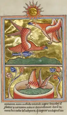 By the time Bruce-Mitford was 16 or 17, his studies had been switched from classics to history; "I was not very good at Greek and Latin", he later wrote, despite devoted tutoring by his brother Terence.[46][44] Around the same time, he came across Samuel Gardner's English Gothic Foliage Sculpture in the school's library,[47] and upon reading it discovered his love of the concrete and visual.[46][48][note 4] In 1933, he was awarded a £100 Baring Scholarship in History to attend Hertford College, Oxford.[49][44] This was a "surprise", he wrote, "for I never had a head for dates and treaties".[46][44] But at Oxford Bruce-Mitford "fell in love with the atmosphere and smell of the oldest part of the Library where, under the flat-arched 15th century ceiling, cases displaying illuminated manuscripts were set out".[46] One, the twelfth-century Ashmole Bestiary, open to a folio of a red eagle on a background of gold, so captured his attention that "after some weeks I could stand my ignorance and quall my curiosity no longer", and, "[s]crewing up my courage", asked for permission to see it; he remained absorbed in the work through lunch and until evicted at the end of the day.[46][48]