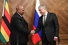Russia – Zimbabwe relations (Russian: Российско-зимбабвийские отношения) date back to the mid-1960s, during the Rhodesian Bush War. The Soviet Union supported Joshua Nkomo's Zimbabwe African People's Union, and supplied them with arms; Robert Mugabe's attempts to gain Soviet support for his Zimbabwe African National Union were rebuffed, leading him to enter into relations with Soviet rival Beijing. Throughout the 1980s Zimbabwean relations with the USSR were notoriously cold. Mugabe "stonewalled" the Soviets "for ten months" rather than establish relations with them while he was establishing relations with other countries including the United Kingdom and the United States. The agreement the Soviets were forced to agree to demanded they meet strict criteria about how they could operate in Zimbabwe, while no other country had to agree to similar concessions before establishing relations. The agreement was described as "embarrassing and humiliating for the Soviets since it singles them out."[1] Mugabe shunned Soviet help and allowed British military bases to be established in Zimbabwe against protests from Moscow. Mugabe also accepted the help of British military advisers and declined the same offers from the Soviet Union. Several American-made movies were aired in Zimbabwean movie theaters in the 1980s that the Soviets believed constituted "anti-Soviet propaganda," including the movies Invasion U.S.A., Red Dawn, Firefox, Rocky IV, Rambo: First Blood Part II, Water, The Living Daylights, The Whistle Blower, and Rambo III. The Soviet embassy officially protested, however, they were allegedly told by Mugabe "to complain to your ZIPRA friends."[2][3] However, since the 2000s Robert Mugabe had strengthened his relations with both Beijing and Moscow as a result of intense western pressure on him. Zimbabwe was one of the few countries that voted with Russia on United Nations General Assembly Resolution 68/262 about the annexation of Crimea.[4][5][6] Russia maintains strong economic and political ties with Zimbabwe. Russia still maintains an embassy in Harare. Both Russia and China still maintain strong economic and political ties with Zimbabwe and both countries had vetoed the UN resolution imposing UN sanctions on Zimbabwe which was proposed by both the US and the UK on July 12, 2008.