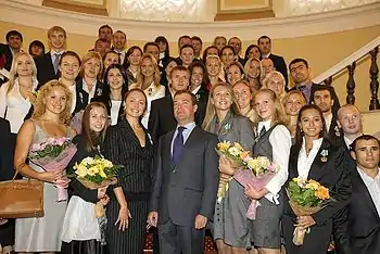 Russian President Dmitry Medvedev with Russian medallists in the Kremlin in September 2008.