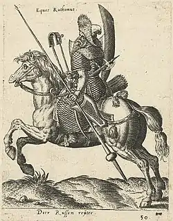 Russian hussars, led in 1654 by Colonel Christopher Rylsky, wore wings.[8] The Armoury has preserved Russian hussar armour of the 17th century. Russian hussars could also be supplied with Reitar Armour. So, for example, Prince Khovansky did in 1661, when he did not have time to receive the hussar plate armour. As the prince wrote: "I have accepted 360 plates in the regiment. Of this number, 91 plates were given to the hussar, while by your (royal) decree, hussar armor will be sent to me, and the remaining 269 plates were given to the regiment of Colonel Davyd Zybin to the reitars... And hussar armor and shishaks did not come to my regiment in July until the 7th, and a hussar cannot be without armor and shishaks and without handcuffs".[9]