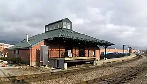 Rutland's first railway station was built near Merchants' Row in 1853-54 by the Rutland Railroad. In 1905-06 wings were added to the north and south of the depot. Passenger service west of Whitehall and Eagle Bridge ended on June 24, 1934.[2][3] The building served the city of Rutland until New York City to Montreal passenger service ended in 1953 (the Rutland RR's Green Mountain Flyer and Mount Royal), and two years later it was demolished.[4][5][6]