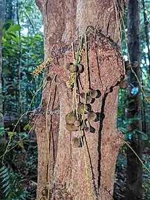 Ryparosa kurrangii is a small evergreen tree which commonly grows to be 15–20 m (49–66 ft) tall – larger specimens often develop fluted trunks and buttress roots.[4][5] The trunk has large irregularly shaped outgrowths (or tubercles) from which flowers and fruit are produced.[4][5] The elliptic leaves are glossy above and sparsely hairy below, and usually measure from 24 to 28 cm (9.4 to 11.0 in) long and from 6 to 7.5 cm (2.4 to 3.0 in) wide.[4][5] They have a well defined acuminate tip (commonly called a "drip tip"), and the base is attenuate (tapering).[4][5] There are 7 or 8 (occasionally 9) secondary veins either side of the midrib. The long petiole (leaf stem) measures between 4 and 5 cm (1.6 and 2.0 in).[4][5]