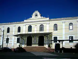 The original building had a façade of exposed bricks, influenced by the English who built the railroad.[8] In 1908, three Italian brothers, Abel, Séttimo, and Bruno Giongo[9] remodeled the building, enlarging the upper floor and elaborating eclectic ornaments. The project was of the Companhia Rio Clarense, together with the Giongo brothers. Besides the station, the complex included old warehouses (to the northwest, in exposed masonry, from 1895)[10] and maintenance workshops (to the south, demolished). To the north, there was also the CIAR Forgery, demolished in the 1960s for the construction of the Quatro de Novembro viaduct. About a dozen other stations were built in the municipality. The São Carlos station operated until 2001 when passenger transport came to an end.[11]