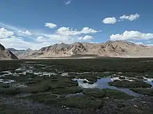 Sengge Zangbo,[1][2] Sengge Khabab[3] (Tibetan: སེང་གེ་ཁ་འབབ།, Wylie: seng ge kha 'bab) or Shiquan He (Chinese: 獅泉河; pinyin: Shīquán Hé) is a river in the Ngari Prefecture in the Tibet Autonomous Region, China that is the source stream of the Indus river, one of the major trans-Himalayan rivers of Central and South Asia. The river rises in the mountain springs north of the Manasarovar lake,[4] and 300 km (190 mi) downstream joins the Gar Tsangpo river near the village of Tashigang. Although it is thereafter called the Indus internationally,[5] the Tibetans continue to regard the combined river to be Sênggê Zangbo as it flows into Ladakh.