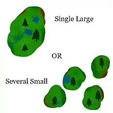 In conservation biology and conservation genetics, metapopulations (i.e. connected groups of sub-populations) are considered to be more stable if they are larger, or have more populations.[8] This is because although individual small populations may go extinct due to stochastic processes of environment or biology (such as genetic drift and inbreeding), they can be recolonized by rare migrants from other surviving populations. Thus several small populations could be better than a single large: if a catastrophe wipes out a single big population, the species goes extinct, but if some regional populations in a large metapopulation get wiped out, recolonization from the rest of the metapopulation can ensure their eventual survival. In cases of habitat loss, when the loss is dispersed, few large reserves are best, when the loss is in clusters, multiple small reserves are best.[9]