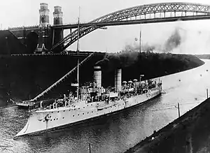 The ship remained in Qingdao for the next several months before being sent in early September to represent Germany at celebrations in San Francisco in the United States marking the progress in rebuilding the city after the 1906 earthquake, along with the 140th anniversary of the European discovery of San Francisco Bay. Arcona also made a port call in Honolulu, Hawaii on the way to San Francisco, and later stopped in Seattle, San Pedro, and San Diego on the West Coast of the United States. While on the way back, she stopped in Honolulu again and pulled the British sailing ship Celtic Chief free after the latter had run aground. Arcona arrived in Yokohama, Japan on 24 December, where her crew went ashore to assist in the suppression of a major fire. She thereafter returned to Qingdao, where on 17 January 1910, she received orders to return to Germany. She steamed south to Weh Island in the Dutch East Indies where she met Leipzig; the two ships exchanged commanders. Schröder, by this time having been promoted to the rank of fregattenkapitän (FK—Frigate Captain), transferred to Leipzig and FK Karl Heuser took command of the ship for the voyage home. After passing through the Suez Canal and stopping in Port Said from 4 to 7 March, she met her replacement, the cruiser Nürnberg, and some officers and enlisted men were exchanged there as well. Arcona arrived back in Wilhelmshaven on 24 March and she was decommissioned there on the 30th.[9]