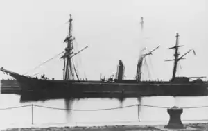 Victoria arrived there on 3 September, where her guns were installed and she was formally commissioned into the Prussian fleet on 14 September. She then began sea trials and shooting drills in the Jade Bight.[5] Kiel became the Prussian fleet's primary base, Konteradmiral (Rear Admiral) Eduard von Jachmann having moved the bulk of the fleet there after the end of the conflict.[1] On 1 October, she passed Skagen and steamed into the Baltic Sea, the war with Denmark all but over by that point, and three days later she anchored in the newly-acquired naval base at Kiel. Victoria joined the steam frigate Vineta on 2 November for a visit to Plymouth, Great Britain. On the way, they were joined by the training ships Niobe, Rover, and Musquito. The latter three vessels were sail-powered only, so the ships could not cross the North Sea until 5 November due to calm winds. Victoria was delayed by bad weather and reached Plymouth on 28 November; on the way back home she stopped in Brest, France and reached Kiel on 22 December. There, she embarked the crew for the new ironclad turret ship Arminius, which had recently been completed in Britain. Victoria escorted Arminius on the trip back to Kiel, where they arrived on 15 May 1865.[5]